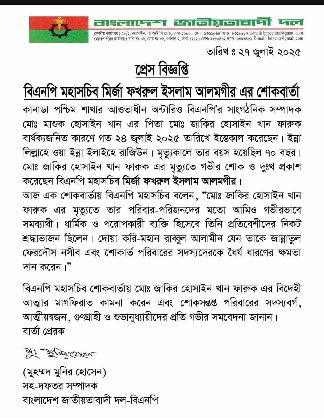 কানাডার বিএনপি পশ্চিম শাখার সংগঠনিক সম্পাদক মো. মাশুক হোসাইন খানের পিতা মো. জাকির হোসাইন খান ফারুক (৭০) গত ২৪ জুলাই